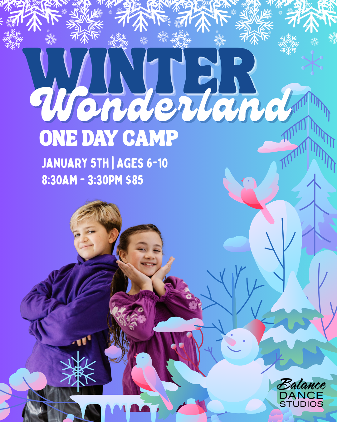 Let it snow, let it dance! On Monday, January 5th, kids ages 6–10 are invited to step into a Winter Wonderland filled with creativity, energy, and festive fun. Campers will spend the day enjoying winter-themed crafts, exciting games, and joyful dancing that captures the sparkle of the season. From snowflakes and frosty fun to upbeat grooves, this one-day holiday camp is the perfect way to celebrate the magic of winter break!