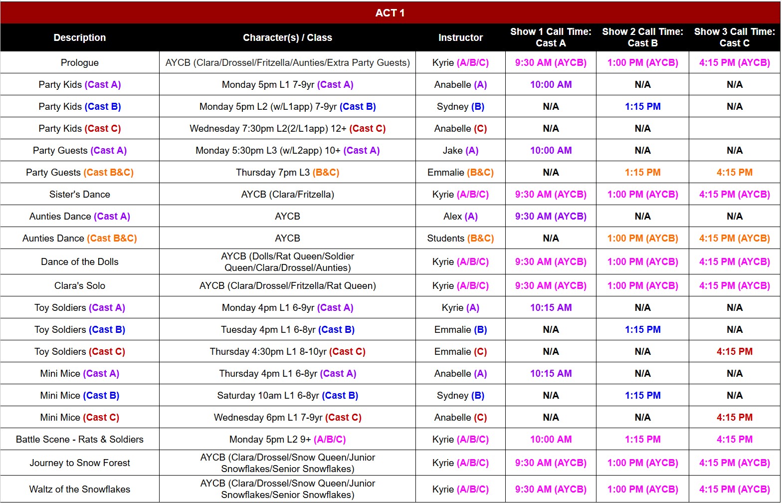 Dancers performing in more than 1 show (A, B, C) may check out from the backstage area during the breaks between shows, however must remain on St. Andrew’s campus and be checked back in by the call times listed below for their next show.