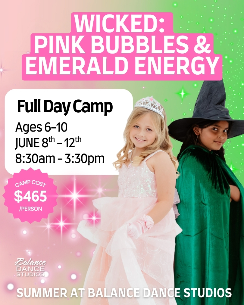 This spellbinding dance camp defies expectations with pink bubbles, emerald energy, and Wicked-inspired fun! Dancers attend W.I.C.K.E.D. University, earning magical badges through jazz, hip hop, and musical theater-style movement. Creative dance challenges, OZ-some crafts, teamwork, and imagination lead to a dazzling Pink Bubbles & Emerald Energy Musical Revue—where confidence grows, friendships shine, and creativity takes center stage.