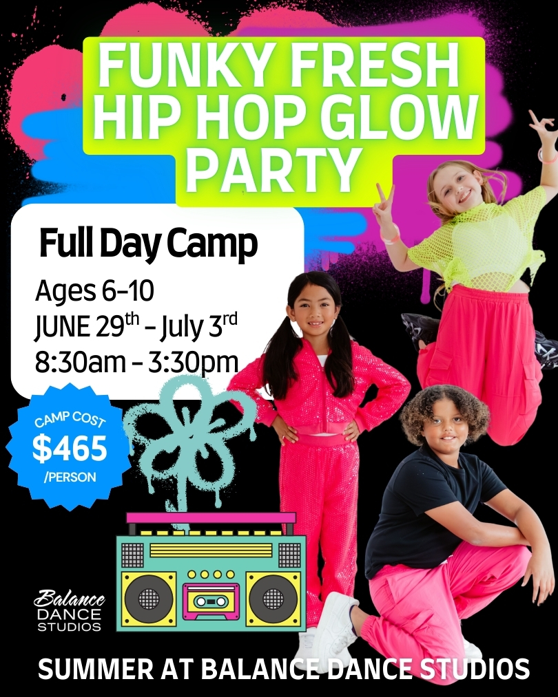 Turn up the energy at our Hip Hop Glow Party dance camp! Dancers learn fresh moves and grooves while collaborating to create and star in their own glow-inspired dance music video. Along with dynamic choreography, campers explore style, wardrobe, props, makeup, and performance. With high-energy music, creative expression, and camera-ready moments, this camp delivers confidence, fun, and unforgettable glow vibes.