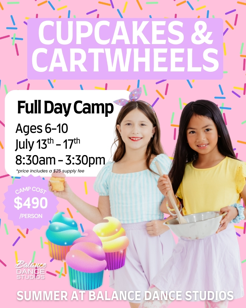Cupcakes & Cartwheels is a sweet and energetic dance camp that blends acro-based movement with creativity and confidence-building fun. Dancers explore strength, flexibility, and coordination through engaging dance classes, teamwork-focused games, and imaginative crafts. This joyful camp encourages movement, creativity, and self-expression—perfect for dancers who love to flip, tumble, and create both on and off the dance floor.