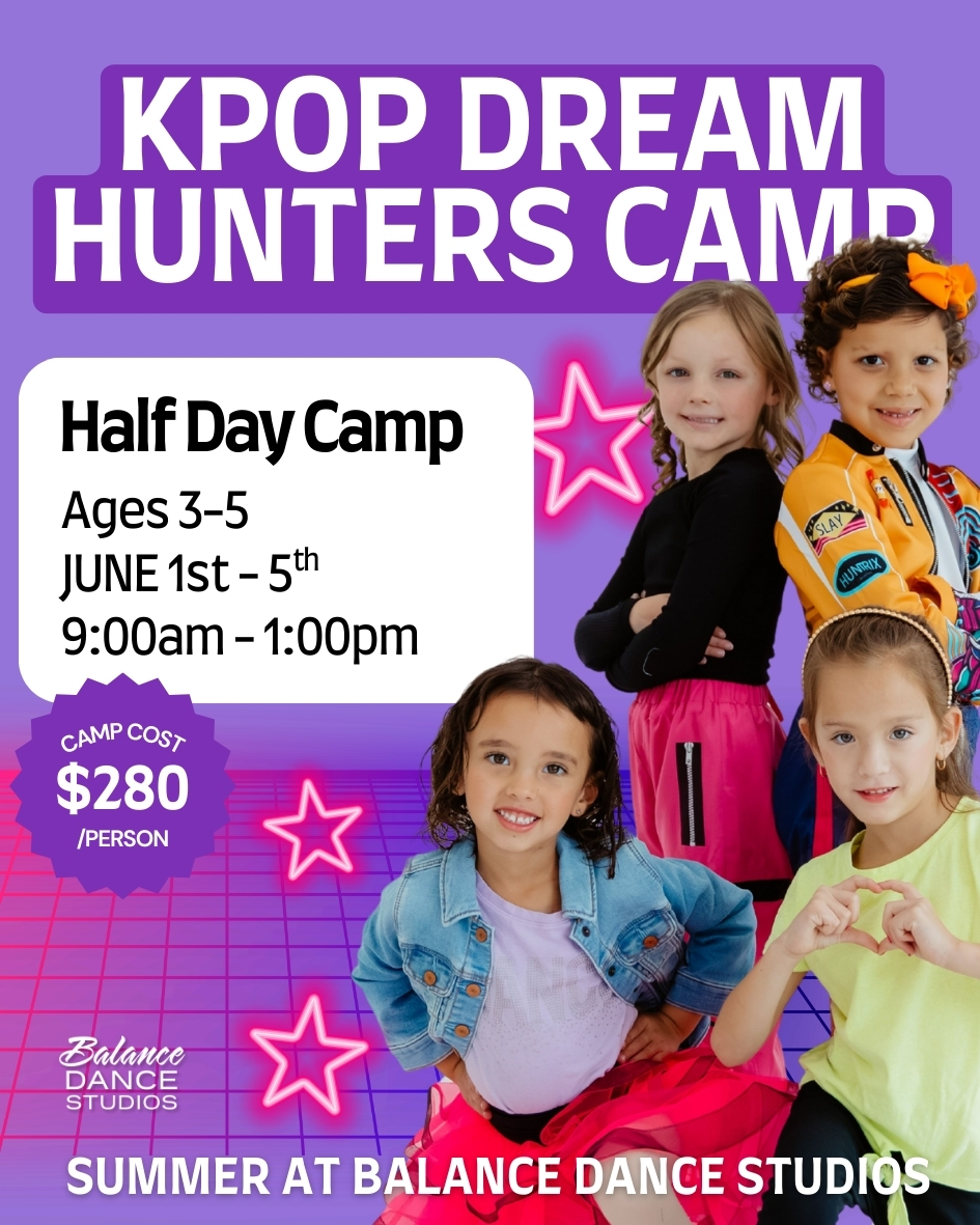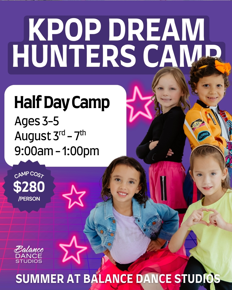 Get ready to dance, perform, and shine! KPop Dream Hunters is a high-energy dance camp inspired by the music, style, and confidence of K-Pop culture. Dancers learn fun choreography, develop performance skills, and build confidence while dancing to upbeat, age-appropriate K-Pop–inspired music. This exciting camp blends dance, creativity, and teamwork in a supportive environment where dancers express themselves and feel like true pop stars.